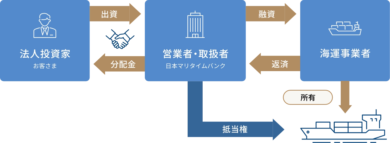 お客様の立場は、ファンドを通じて船舶の「所有者」になるのではなく、すでに船を保有・運航している船会社へ資金を貸す「融資の貸し手」です。そのため、海運ビジネス特有のリスクを直接負うことはありません。